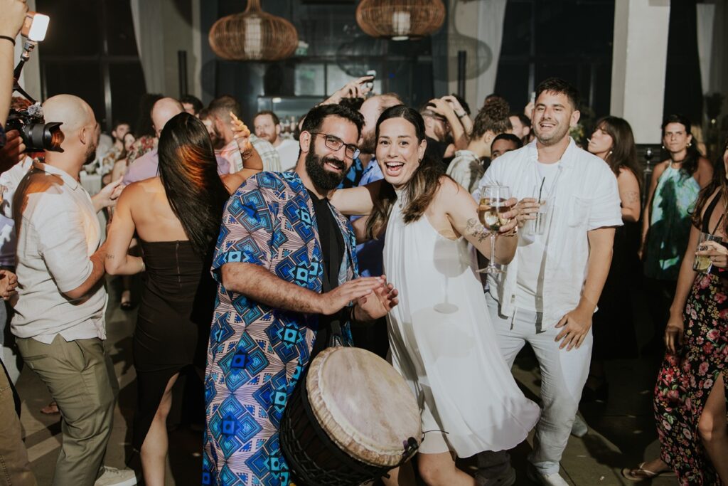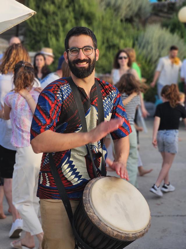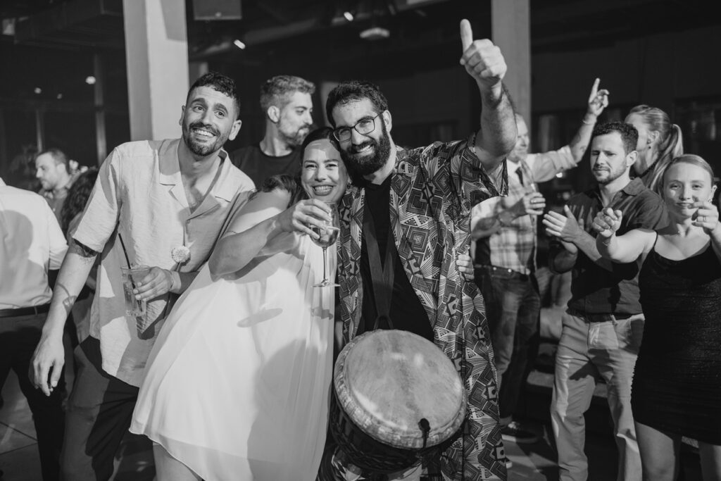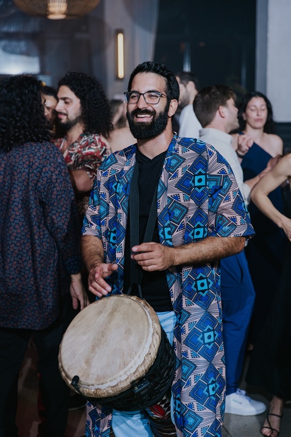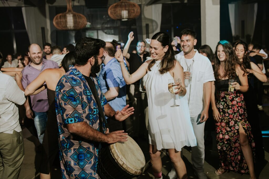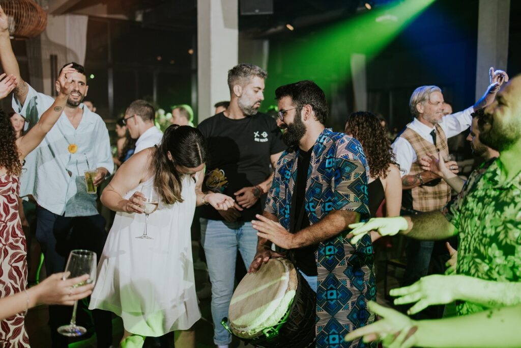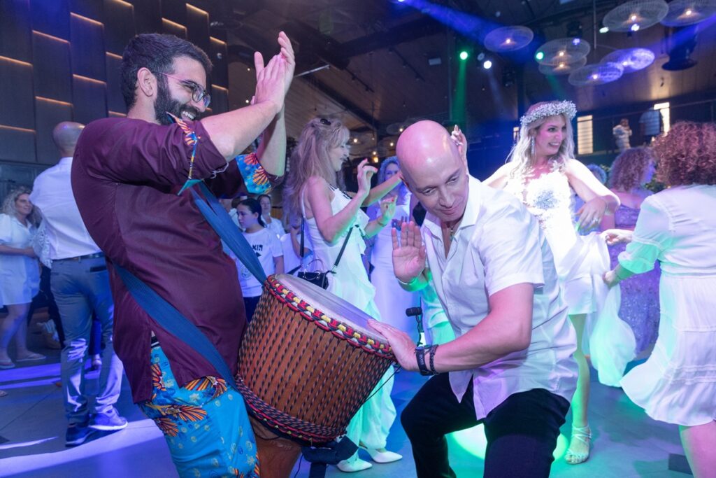 תיפוף חי על דג'מבה לצד הדיג'יי – שילוב שמדליק כל רחבה עם תחושה חיה ומחברת שלא תשאיר אף אורח אדיש.